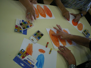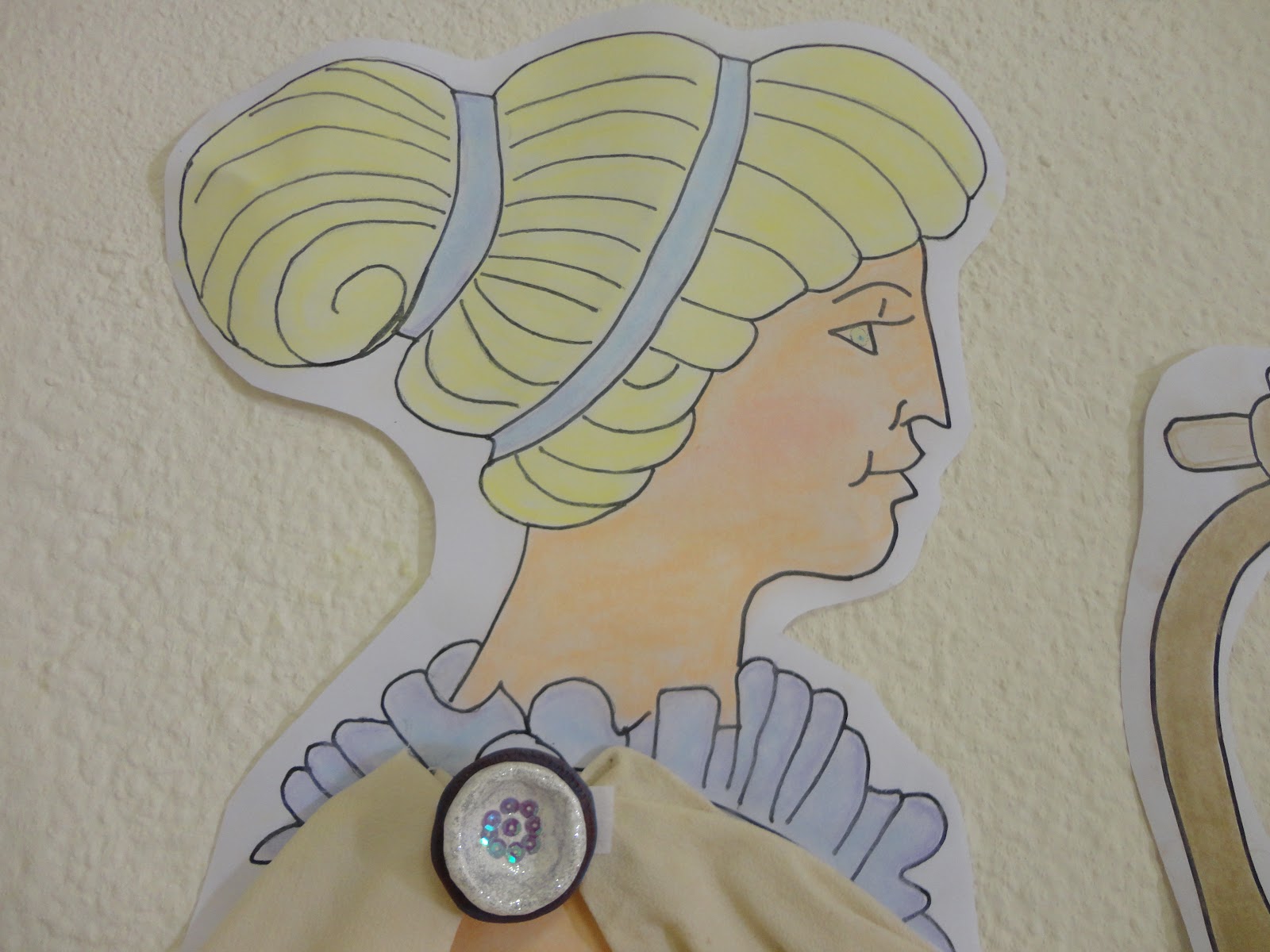 Con tiza hemos coloreado el dibujo. Para darle un toque más real, hemos utilizado cola con agua hemos impregnado un trozo de tela, le hemos dado forma cuando estaba medio seco y lo hemos terminado de pegar haciéndole los pliegues.