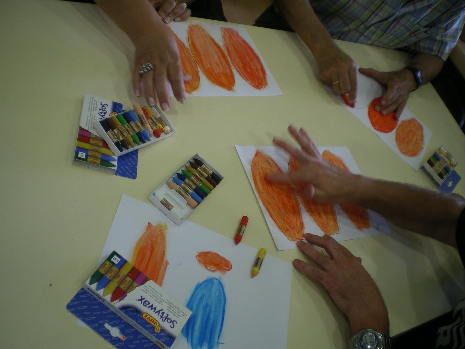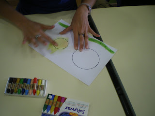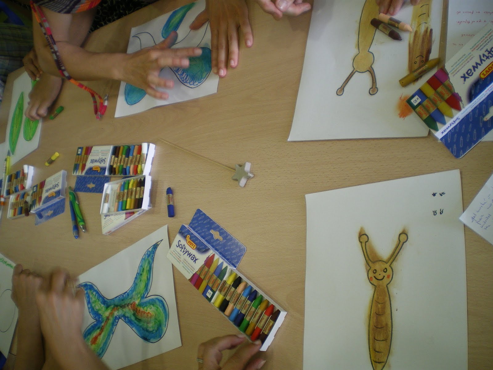 Se le entrega a cada alumno un folio con unos dibujos,(partes de una flor, del sol, mariposa... y cuanto se quiera), en los cuales pondrán color con las ceras y depués con el dedo se esparce.